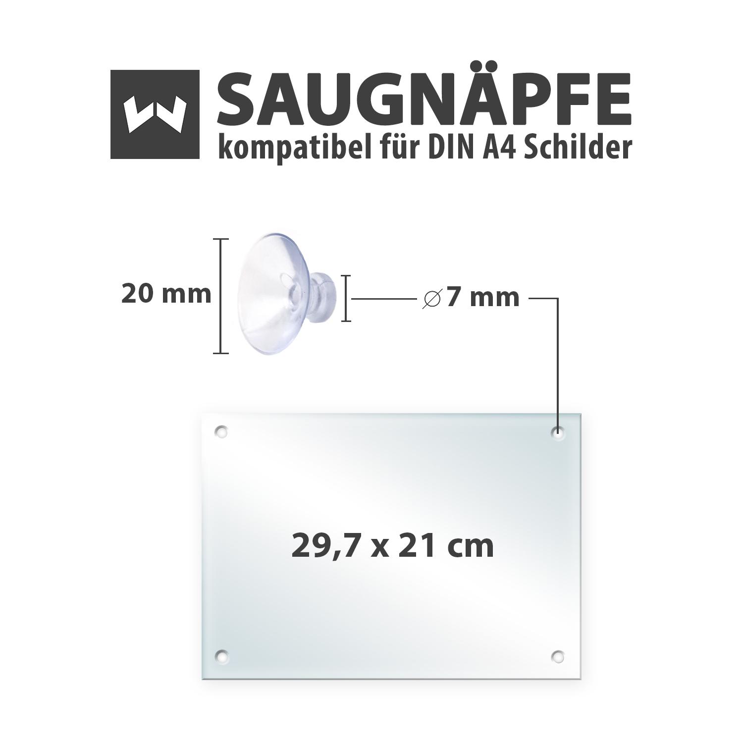 Kleine und dezente Saugnäpfe mit sehr guter Haftkraft. Das Viererset ist kompatibel mit allen DIN A4 Schildern.