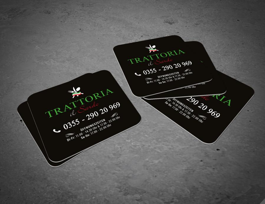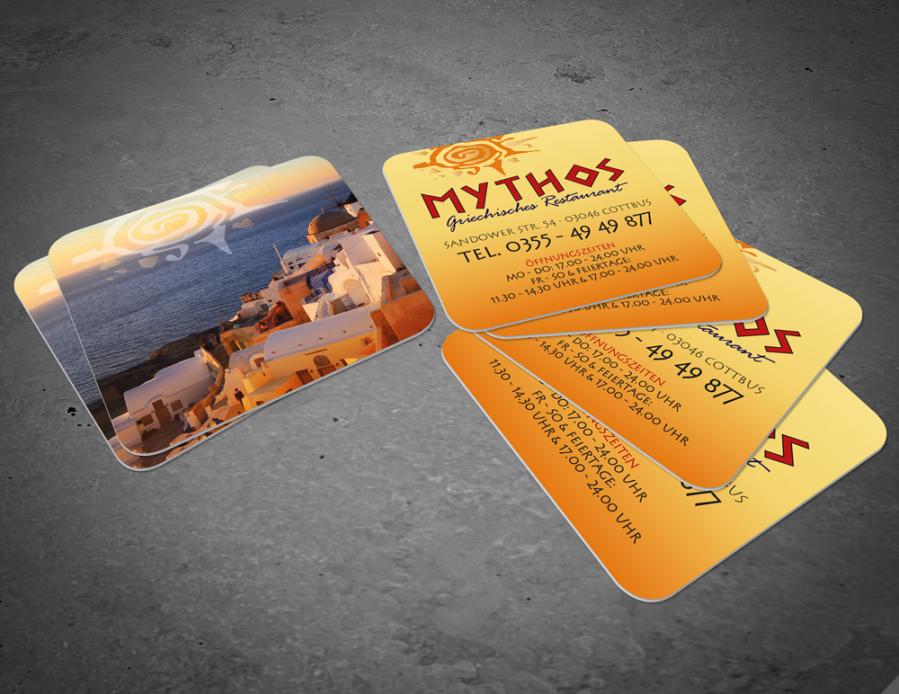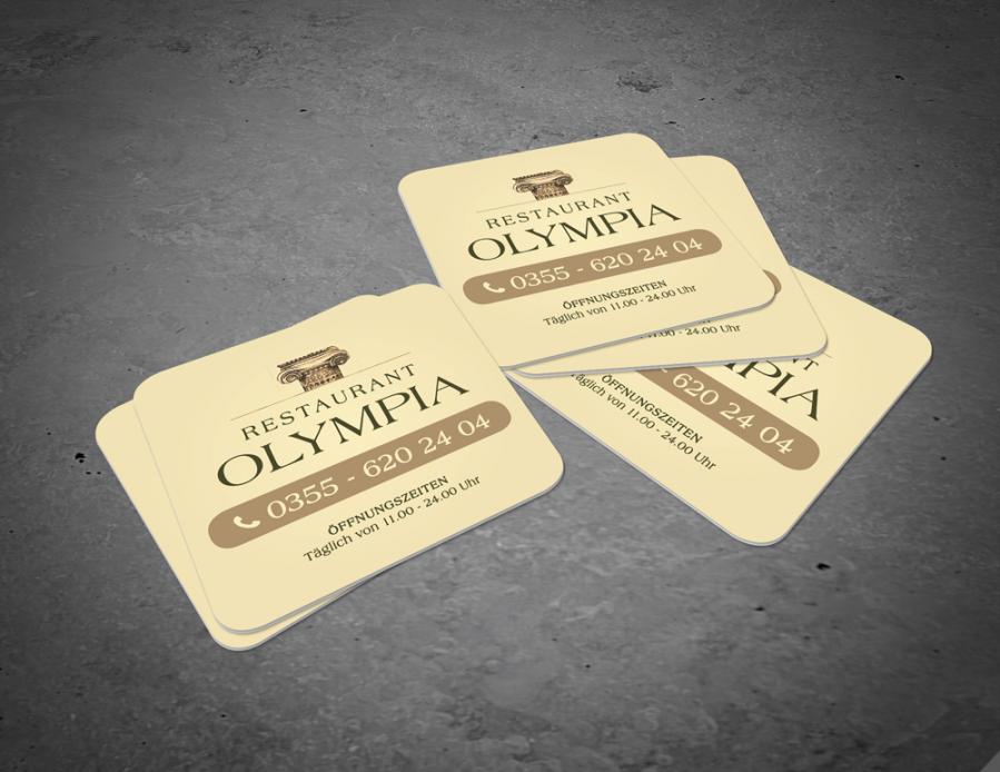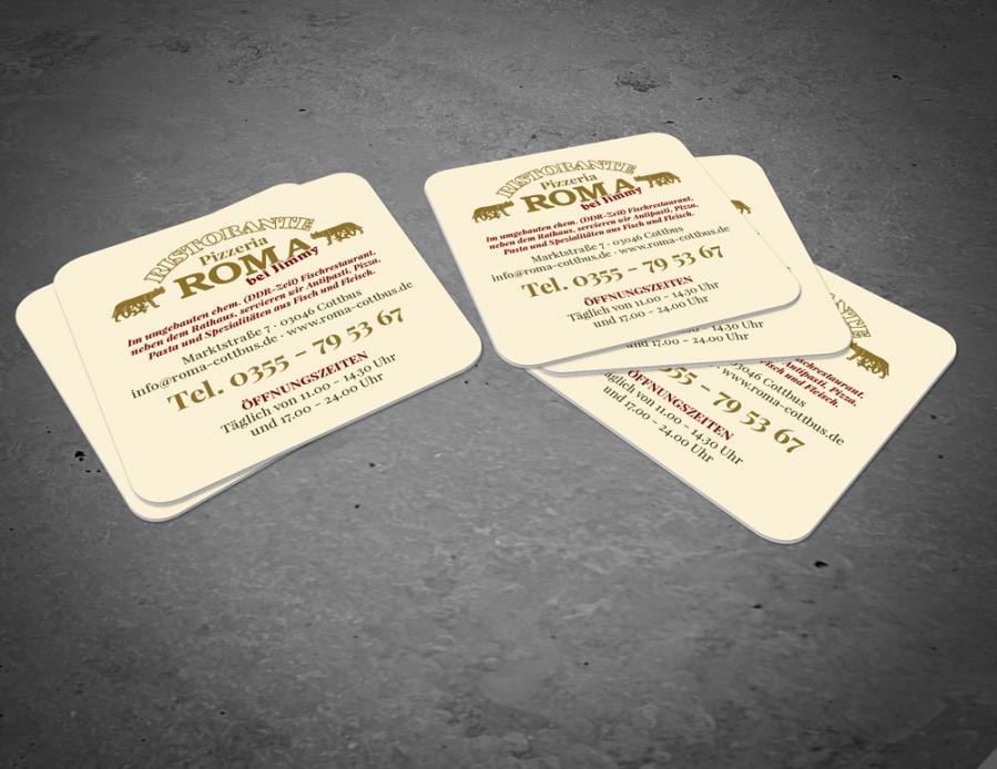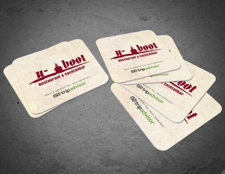 Wir drucken Ihre Werbung auf guter 1,4mm starken Bierdeckelpappe. Das Material ist ökologisch nachhaltig, biologisch abbaubar und kompostierbar.