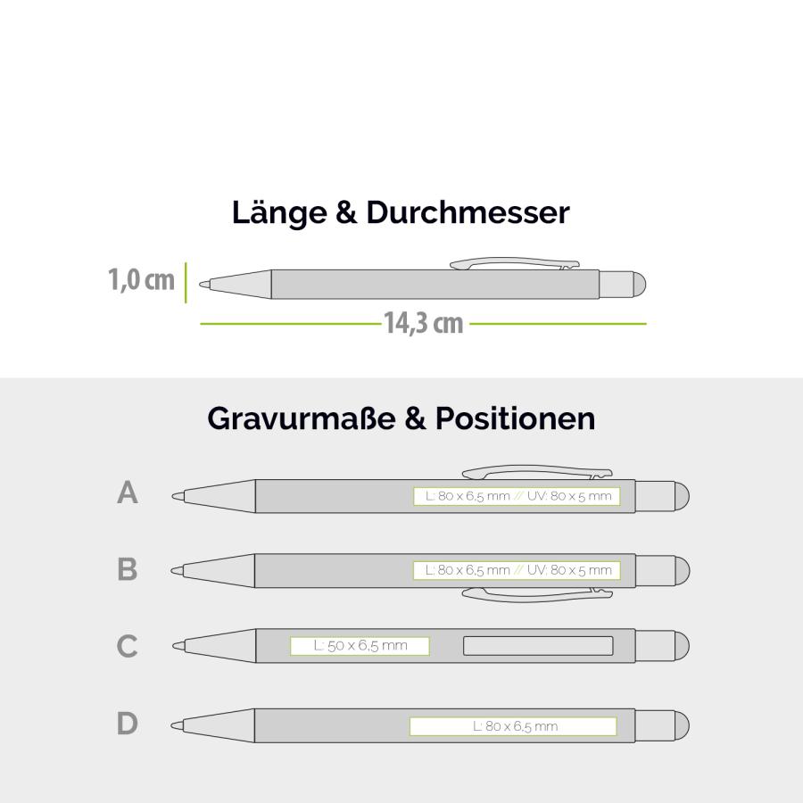 Ja – unser Kugelschreiber mit farbigen Touchpen kann per Lasergravur oder UV-Druck nach Ihren Wünschen veredelt werden, damit Ihr Logo dauerhaft sichtbar bleibt.