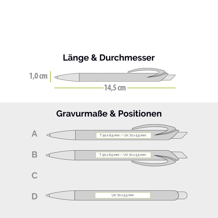 Ja, Sie können den Kugelschreiber mit Gelmine sowohl per Lasergravur als auch per UV-Druck veredeln lassen.