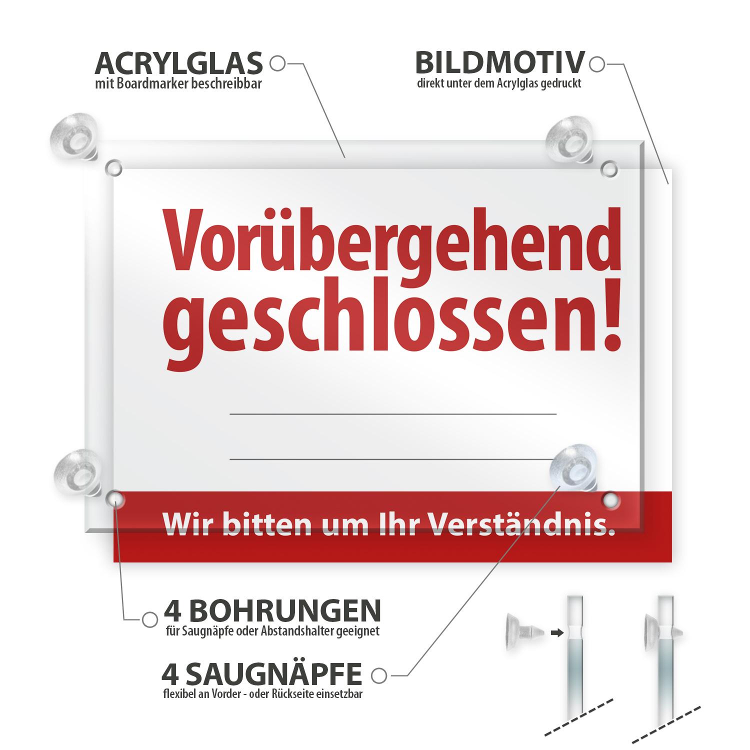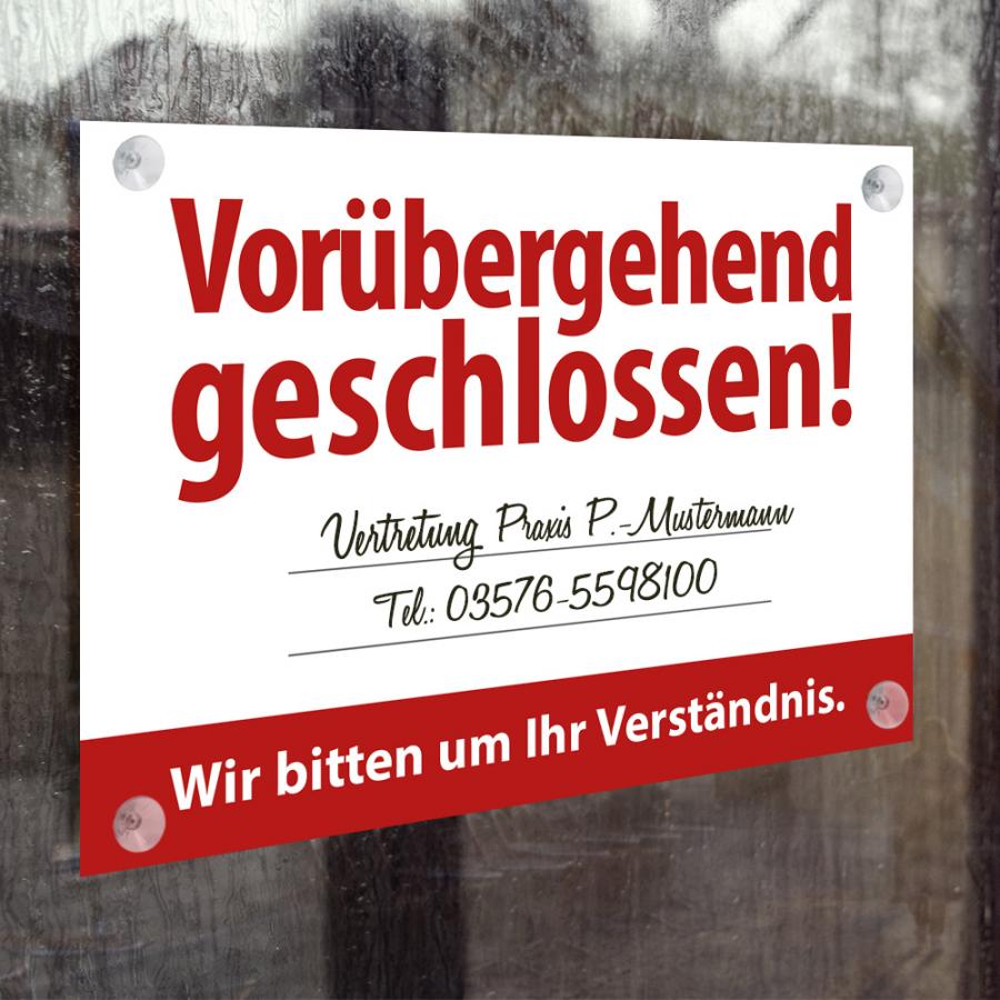 Dieses Schild zeigt Ihren Kunden, Gästen oder Patienten, dass Sie derzeit geschlossen haben. Auf dem Acrylglasschild befindet sich außerdem eine freie Fläche in der Sie Ihren Abwesenheitszeitraum, eine Notfallnummer, Vertretungsarzt oder andere wichtige Notizen mit einem White-Boardmarker eintragen können.