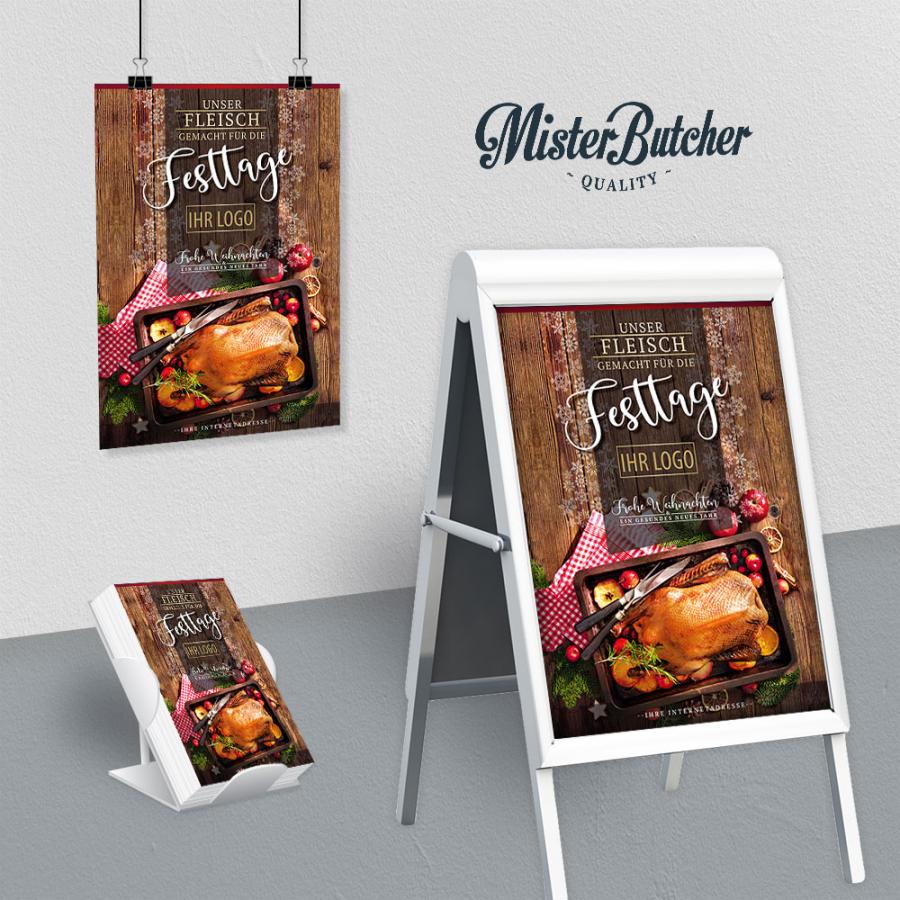 Verleihen Sie Ihrem Laden zur Weihnachtszeit festlichen Glanz mit unserem hochwertigen Werbeplakat. Das Motiv des saftig gebratenen Enten- und Gänsebratens ist perfekt, um Ihren Kunden Appetit auf den Weihnachtsbraten zu machen. Platzieren Sie das Plakat in Ihrem Schaufenster oder Verkaufsraum, um zur Festtagszeit mehr Aufmerksamkeit zu erzeugen.