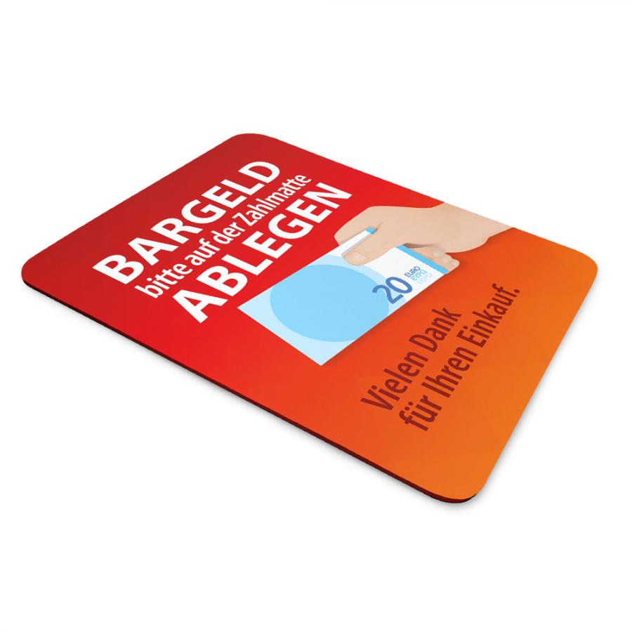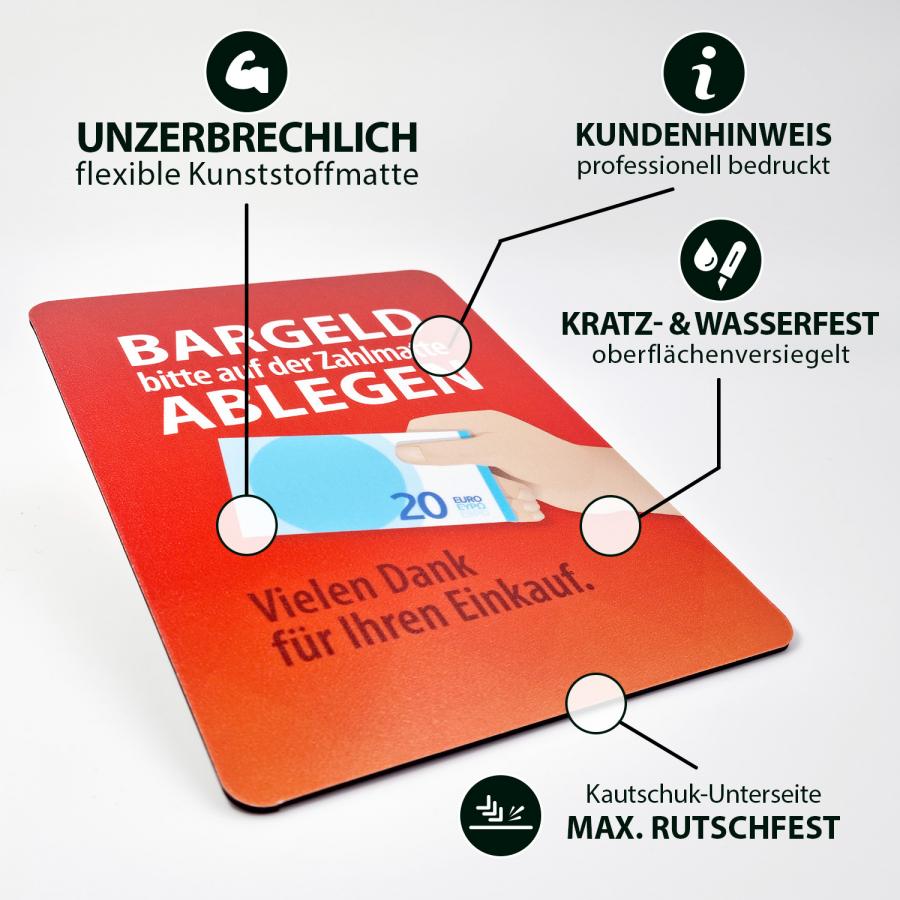 Die Oberfläche ist mit einem auffälligen rot-orangenem Farbverlauf bedruckt und kommuniziert mit einer schönen Grafik und weißem Schriftzug, dass das Bargeld nicht von Hand zu Hand gereicht wird. Auf dem hochwertigen Farbdruck ist zusätzlich eine Oberflächenschutzschicht aufgebracht, diese macht die Zahlmatte sehr kratzfest und leicht zu reinigen.