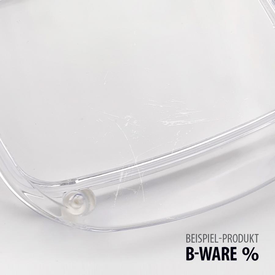 Kassierteller aus Acryl mit Kratzer und Kleberrückständen, die aus der Produktion stammen.